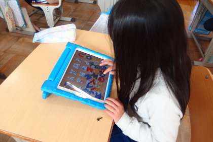 12月14日の東広瀬小学校(46) 公開日 2022/12/14 更新日 2022/12/14 活動の様子 2年生の外国語活動の授業です。 タブレットのアプリ「ABCパズル」に取り組んでいる2年生です。