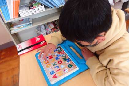 タブレットのアプリ「ABCパズル」に取り組んでいる2年生です。