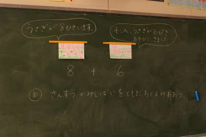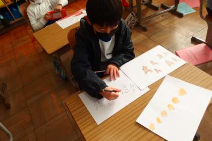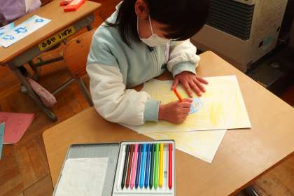 紙芝居を描いている1年生です。