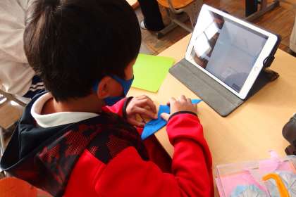 タブレットを使って遊んでいるように見えてしまいますが、来週の遠足の企画を真剣に考えている5年生です。