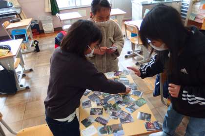 カルタ大会を目指して、石野カルタの練習をする3年生です。