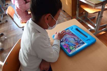 タブレットに健康観察を入力しているところです。