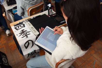 タブレットに健康観察を入力しているところです。