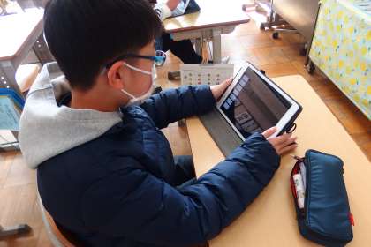 タブレットのアプリで既習事項の定着を図る6年生です。