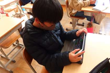 タブレットのアプリで既習事項の定着を図る6年生です。