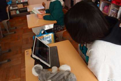 タブレットのアプリで既習事項の定着を図る6年生です。