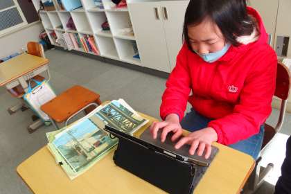 調べたことをタブレットのシンプルプレゼンでまとめている4組の児童です。