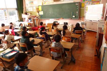 Teamsでつないだオンライン全校集会を視聴する1年生です。