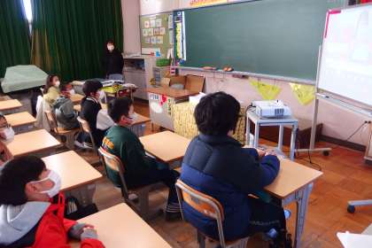 Teamsでつないだオンライン全校集会を視聴する5年生です。