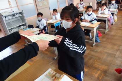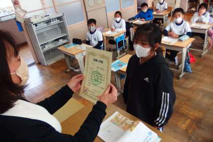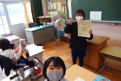 校長先生から広瀬っ子賞を受け取っている3年生です。