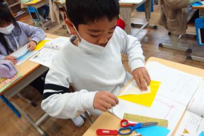 1月16日の東広瀬小学校(24) 公開日 2023/01/16 更新日 2023/01/16 活動の様子 3年生の算数の授業です。 折り紙で一人2枚ずつ正三角形を作っています。 その正三角形を互いに持ち寄って新しい図形を組み合わせて作る、協働的な学びの場面につなげていきます。