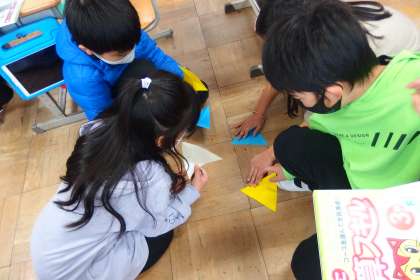 1月16日の東広瀬小学校(27) 公開日 2023/01/16 更新日 2023/01/16 活動の様子 3年生の算数の授業です。 折り紙で一人2枚ずつ正三角形を作っています。 その正三角形を互いに持ち寄って新しい図形を組み合わせて作る、協働的な学びの場面につなげていきます。