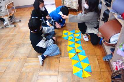 1月16日の東広瀬小学校(28) 公開日 2023/01/16 更新日 2023/01/16 活動の様子 3年生の算数の授業です。 折り紙で一人2枚ずつ正三角形を作っています。 その正三角形を互いに持ち寄って新しい図形を組み合わせて作る、協働的な学びの場面につなげていきます。