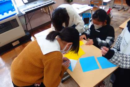 1月16日の東広瀬小学校(33) 公開日 2023/01/16 更新日 2023/01/16 活動の様子 3年生の算数の授業です。 折り紙で一人2枚ずつ正三角形を作っています。 その正三角形を互いに持ち寄って新しい図形を組み合わせて作る、協働的な学びの場面につなげていきます。
