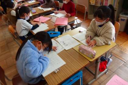 1年生の国語の授業です。 読み合い、尋ね合い、学び合いのスタイルで学習を進めていました。