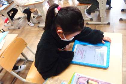タブレットで復習をしている3年生です。
