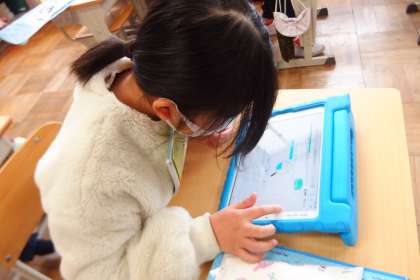 タブレットで復習をしている3年生です。