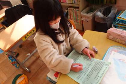 めでぃすやチャレンジカード、めでぃすやポイントカードに記入をしている1年生です。