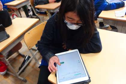 タブレットのデジタルドリルを使って復習をする5年生です。