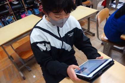 タブレットのデジタルドリルを使って復習をする5年生です。
