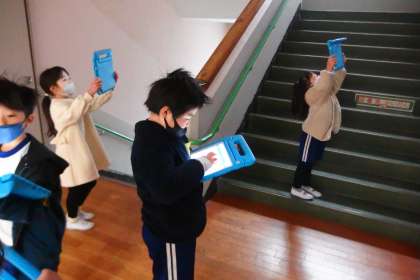 教室内、校舎内で「数字」を見つけて、タブレットで撮影しているところです。