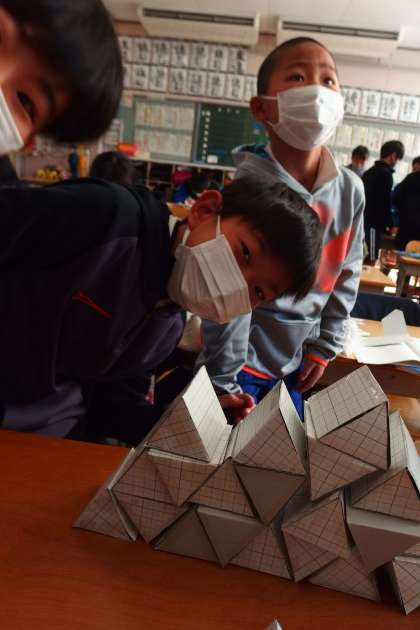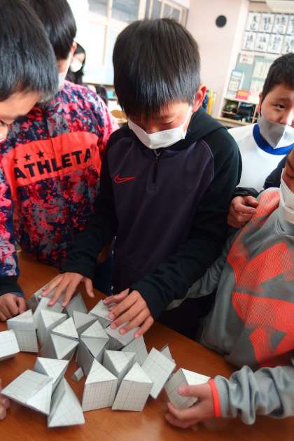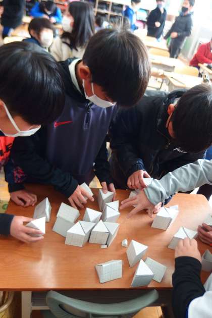 5年生の算数の授業です。 展開図を書いてから、実際に三角柱を組み立ててみました。