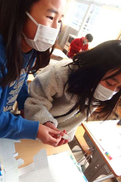 1月31日の東広瀬小学校(11) 公開日 2023/02/02 更新日 2023/02/02 活動の様子 5年生の算数の授業です。 展開図を書いてから、実際に三角柱を組み立ててみました。 写真では見えないですが・・・とても小さな三角柱を作り上げました。