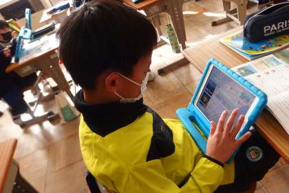 都道府県の学習の中で、宮城県の名勝地松島のことをタブレットで調べているところです。