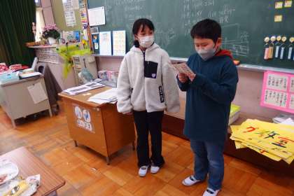 4年生の教室で、6年生を送る会のことについて説明をしている5年生です。