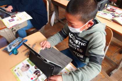 日本の伝統なことについての3ヒントクイズを考え、タブレットに問題を書き込んでいるところです。