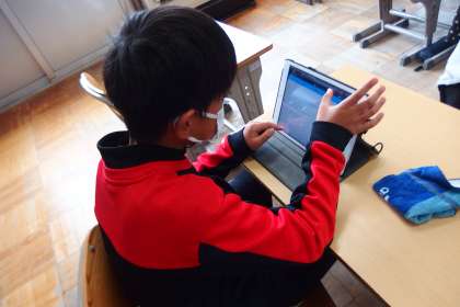 タブレットに健康観察を入力している5年生です。