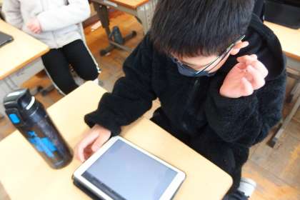 タブレットに健康観察を入力している5年生です。