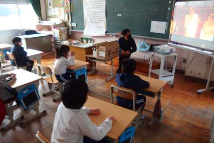 3年生の朝の会の様子です。 先生がタブレットからスクリーンに映し出す動画を視聴していました。