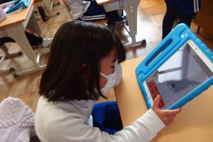 タブレットのアプリを使って都道府県の復習をしている4年生です。