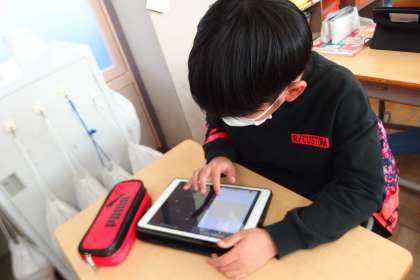先週に引き続き、ALTの先生に紹介する日本の文化やイベントの3ヒントクイズを、タブレットを使って作成しています。