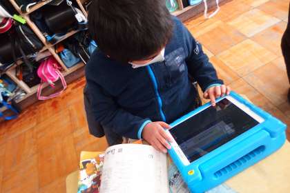 先週に引き続き、ALTの先生に紹介する日本の文化やイベントの3ヒントクイズを、タブレットを使って作成しています。