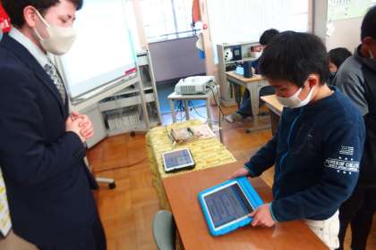 日本の文化やイベントについて考えた3ヒントクイズを、タブレットを見せながら、ALTの先生に出題しているところです。