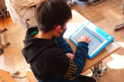 タブレットに健康観察を入力している1年生です。