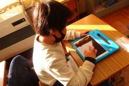 タブレットに健康観察を入力している1年生です。