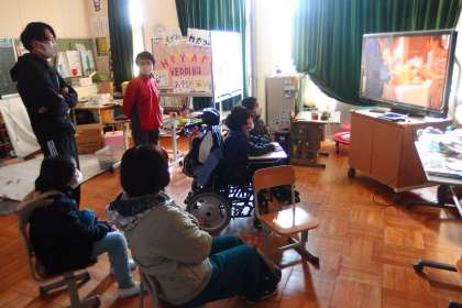 特別支援学級のみなさんがタブレットから映す動画を見ながら授業を進めていました。