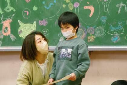 担任の先生のサポートを受けながら発表を進めている1年生です。