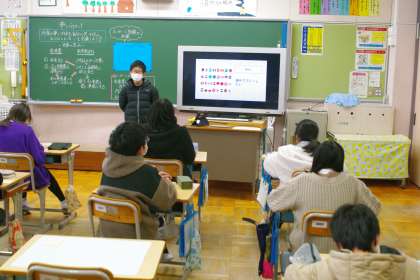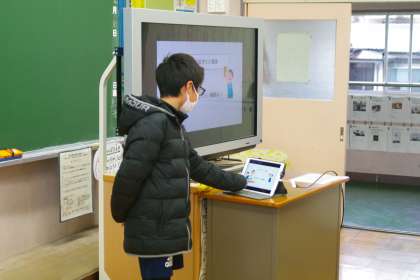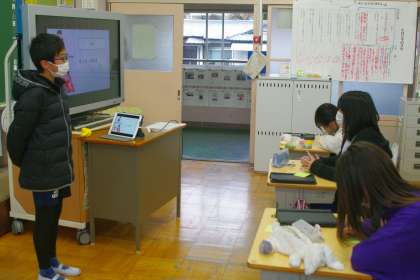 調べてきたことをタブレットから電子黒板に映し出し、しっかりと発表をしている6年生です。