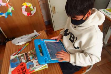 タブレットを使って、日本の三大絶景や有名な観光地を調べていました。