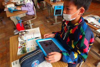 タブレットを使って、日本の三大絶景や有名な観光地を調べていました。
