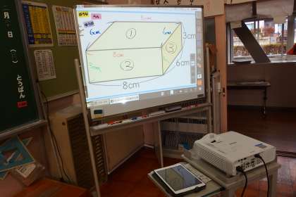 長さを示した図をタブレットからスクリーンに映し出して、子どもたちはそれを見ながら活動を進めていました。