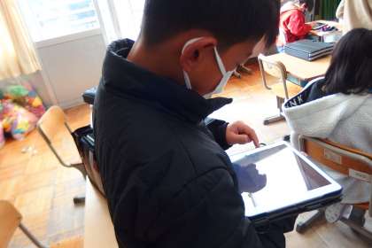 健康観察をタブレットに入力している5年生です。