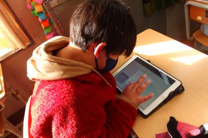 健康観察をタブレットに入力している5年生です。