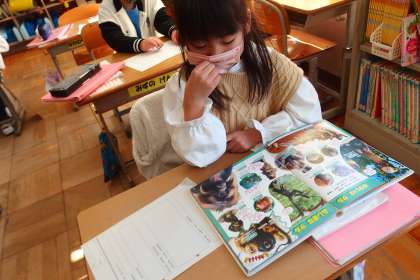 調べ物はタブレットを使うことが多くなってきましたが、図鑑や参考図書も上手に使えるようにトレーニングしています。