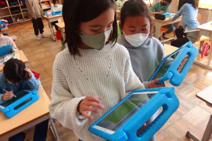 3月2日の東広瀬小学校(49) 公開日 2023/03/04 更新日 2023/03/04 活動の様子 3年生の外国語活動の授業です。 What's this? の表現を使った3ヒントクイズを行いました。 友だちや先生に出題しやすいようにタブレットにヒントを書き込みました。