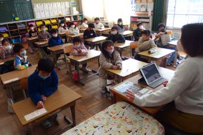 1年生の朝の会の様子です。 担任の先生はタブレットを見ながら子どもたちに連絡を伝えています。